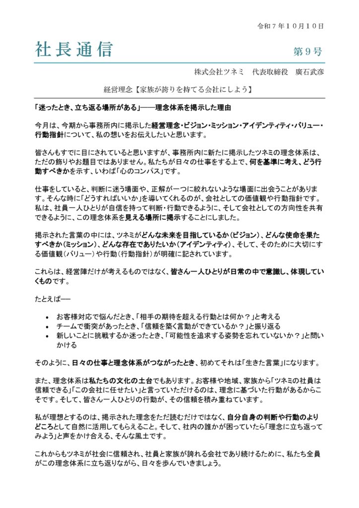 社長通信 社長通信第9号! 2025.10.10 Post Share Line note 迷ったときに立ち返る場所がある為に事務所に「経営理念、ビジョン、ミッション、アイデンティティ、バリュー、行動指針」を掲載しました。その意味を通信にまとめています。 Post Share Line note へいちくフェスタ参加! 前の記事 ギラヴァンツ北九州vsFC琉球イベント出展! 次の記事